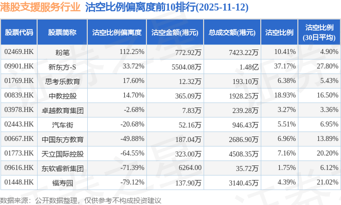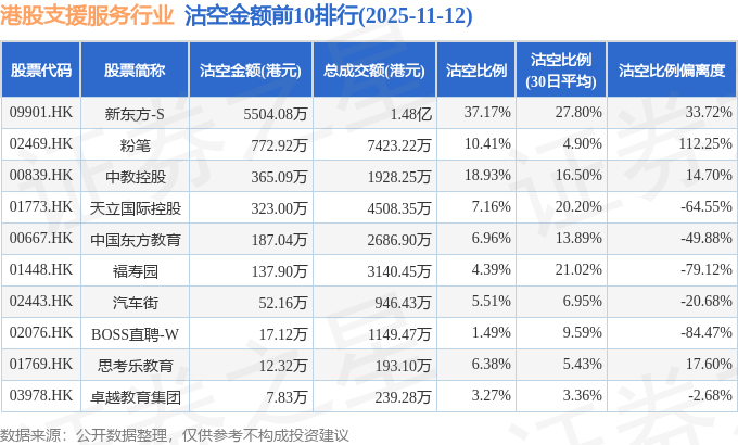 从沽空金额来看,新东方-S、粉笔、中教控股沽空金额位居行业前三,分别为5504.08万港元、772.92万港元、365.09万港元。