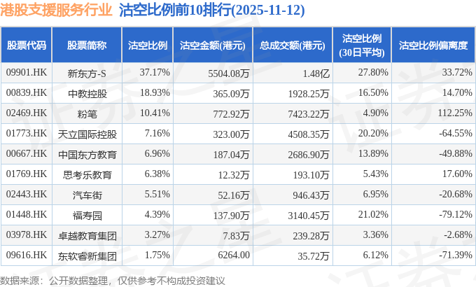 从沽空比例来看,新东方-S、中教控股、粉笔沽空比例位居行业前三,分别为37.17%、18.93%、10.41%。