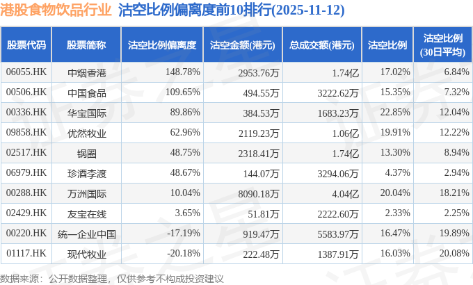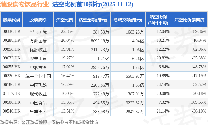 从沽空比例来看,华宝国际、万洲国际、优然牧业沽空比例位居行业前三,分别为22.85%、20.04%、19.91%。