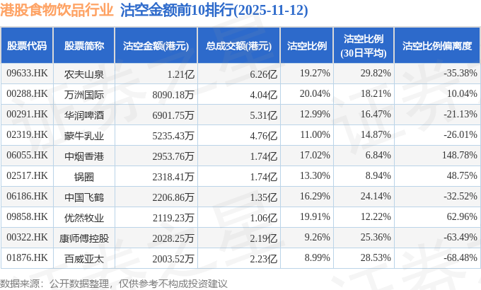 从沽空金额来看,农夫山泉、万洲国际、华润啤酒沽空金额位居行业前三,分别为1.21亿港元、8090.18万港元、6901.75万港元。