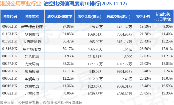 从沽空比例偏离度来看,新天绿色能源、华润燃气、大唐新能源沽空比例偏离度位居行业前三,分别为97.98%、91.05%、86.47%。