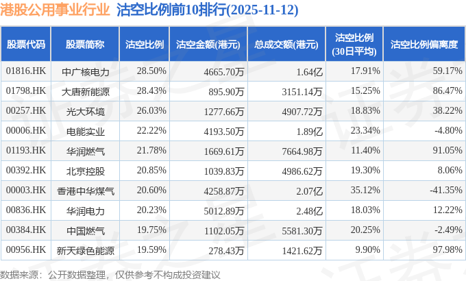 从沽空金额来看,中电控股、华润电力、中广核电力沽空金额位居行业前三,分别为5439.68万港元、5012.89万港元、4665.7万港元。