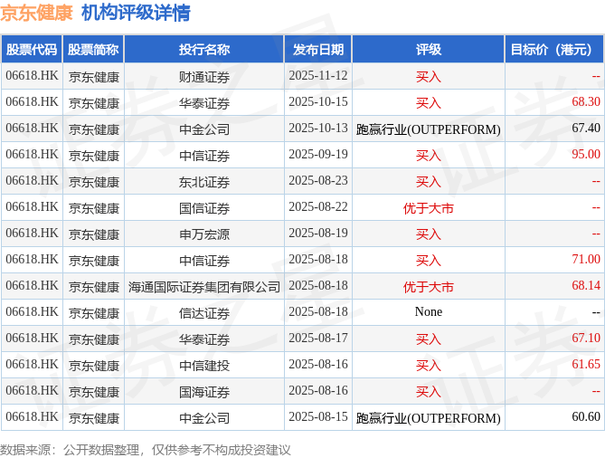 投行对该股的评级以买入为主,近90天内共有9家投行给出买入评级,近90天的目标均价为69.9港元。财通证券最新一份研报给予京东健康买入评级。