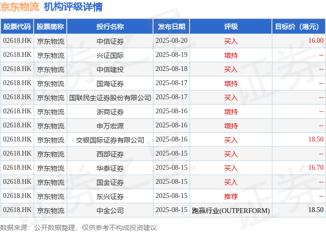 截至2025年11月13日收盘,京东物流(02618.HK)报收于12.9港元,下跌0.77%,成交量831.45万股,成交额1.08亿港元。投行对该股的评级以买入为主,近90天内共有7家投行给出买入评级,近90天的目标均价为17.42港元。中信证券最新一份研报给予京东物流买入评级,目标价16港元。