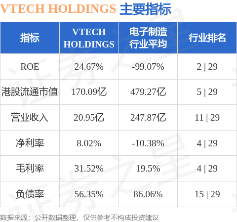 VTECH HOLDINGS港股市值170.09亿港元,在电子制造行业中排名第5。主要指标见下表: