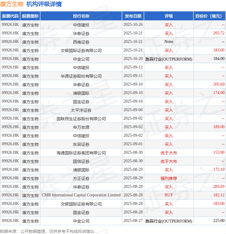 截至2025年11月13日收盘,康方生物(09926.HK)报收于121.5港元,上涨3.23%,成交量924.88万股,成交额11.19亿港元。投行对该股的评级以买入为主,近90天内共有17家投行给出买入评级,近90天的目标均价为188.85港元。中信建投最新一份研报给予康方生物买入评级。