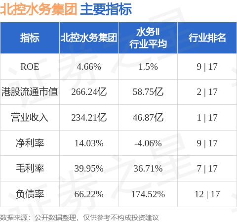 北控水务集团港股市值266.24亿港元,在水务Ⅱ行业中排名第2。主要指标见下表: