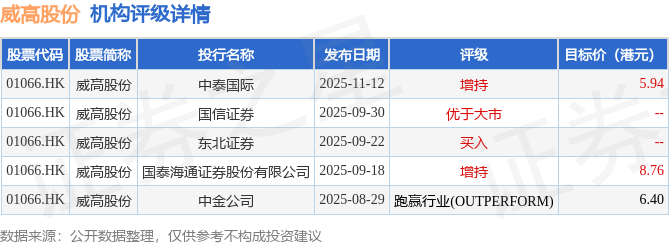 截至2025年11月13日收盘,威高股份(01066.HK)报收于5.53港元,下跌0.54%,成交量931.88万股,成交额5140.27万港元。投行对该股的评级以增持为主,近90天内共有2家投行给出增持评级,近90天的目标均价为7.03港元。中泰国际最新一份研报给予威高股份增持评级,目标价5.94港元。