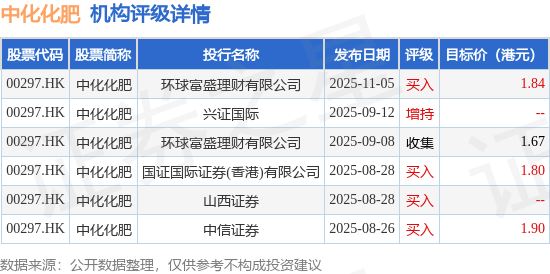 截至2025年11月13日收盘,中化化肥(00297.HK)报收于1.7港元,上涨1.8%,成交量3421.63万股,成交额5822.13万港元。投行对该股的评级以买入为主,近90天内共有4家投行给出买入评级,近90天的目标均价为1.8港元。环球富盛理财有限公司最新一份研报给予中化化肥买入评级,目标价1.84港元。