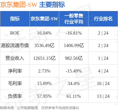 京东集团-SW港股市值3536.49亿港元,在一般零售行业中排名第2。主要指标见下表: