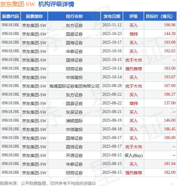 截至2025年11月13日收盘,京东集团-SW(09618.HK)报收于124.4港元,下跌0.24%,成交量1209.27万股,成交额14.89亿港元。投行对该股的评级以买入为主,近90天内共有10家投行给出买入评级,近90天的目标均价为176.41港元。东方证券最新一份研报给予京东集团-SW买入评级,目标价190.96港元。