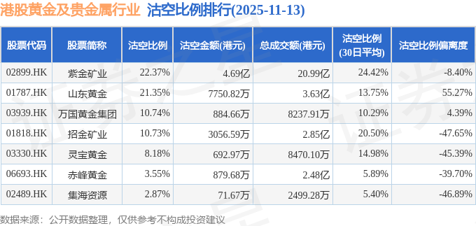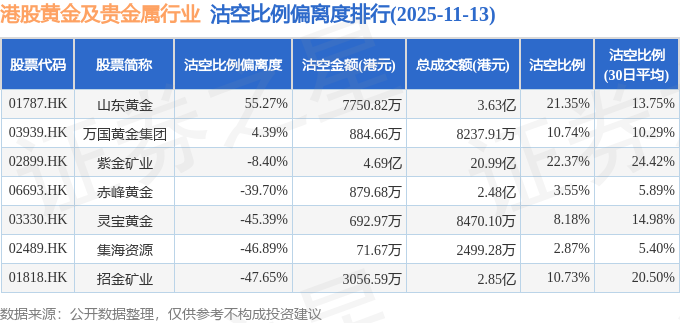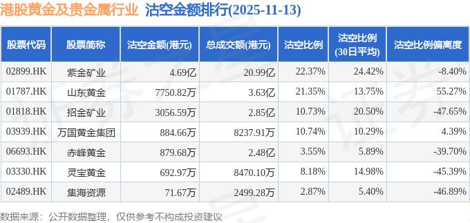 从沽空金额来看,紫金矿业、山东黄金、招金矿业沽空金额位居行业前三,分别为4.69亿港元、7750.82万港元、3056.59万港元。