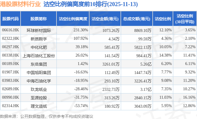 从沽空比例偏离度来看,环球新材国际、新质数字、中化化肥沽空比例偏离度位居行业前三,分别为231.3%、107.92%、39.18%。