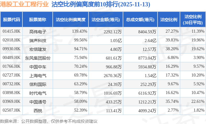 从沽空比例偏离度来看,高伟电子、瑞声科技、宏信建发沽空比例偏离度位居行业前三,分别为139.43%、99.56%、94.71%。