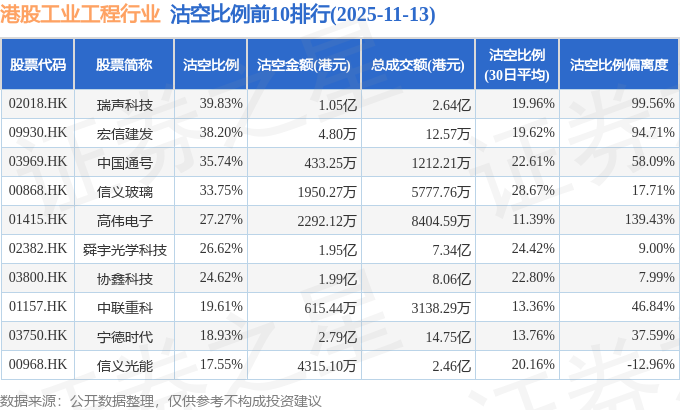 从沽空比例来看,瑞声科技、宏信建发、中国通号沽空比例位居行业前三,分别为39.83%、38.2%、35.74%。
