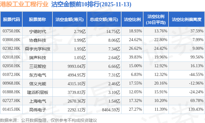 从沽空金额来看,宁德时代、协鑫科技、舜宇光学科技沽空金额位居行业前三,分别为2.79亿港元、1.99亿港元、1.95亿港元。