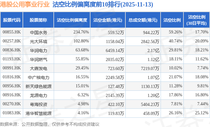 从沽空比例来看,中国水务、光大环境、香港中华煤气沽空比例位居行业前三,分别为59.26%、40.74%、34.12%。