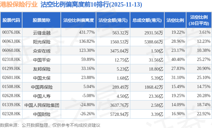 从沽空比例偏离度来看,云锋金融、阳光保险、众安在线沽空比例偏离度位居行业前三,分别为431.77%、136.82%、123.3%。