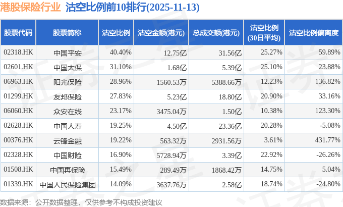 从沽空比例来看,中国平安、中国太保、阳光保险沽空比例位居行业前三,分别为40.4%、31.1%、28.96%。