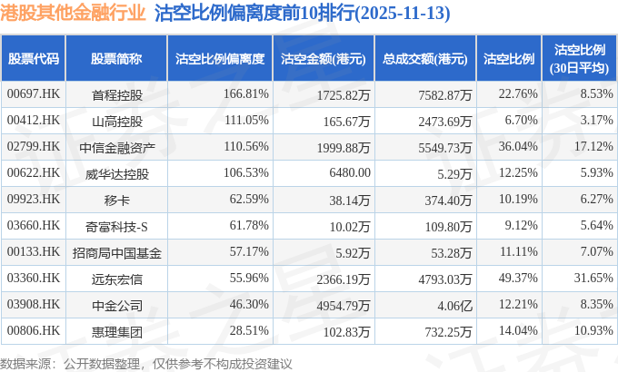 由于港股人民币柜台交易股票成交金额较小,沽空比例普遍偏高,为了避免干扰,已将人民币柜台交易股票从排行表格中剔除。