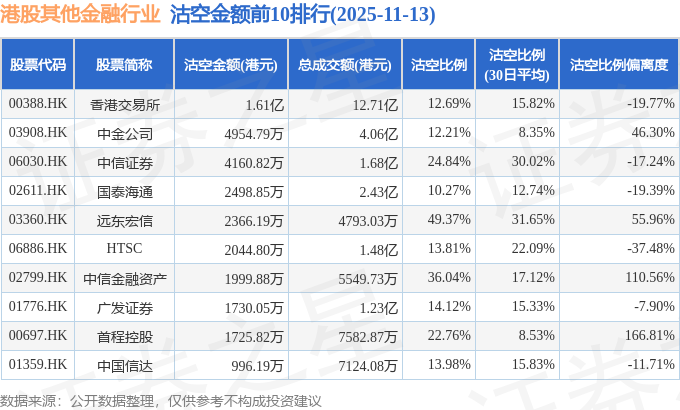 从沽空金额来看,香港交易所、中金公司、中信证券沽空金额位居行业前三,分别为1.61亿港元、4954.79万港元、4160.82万港元。