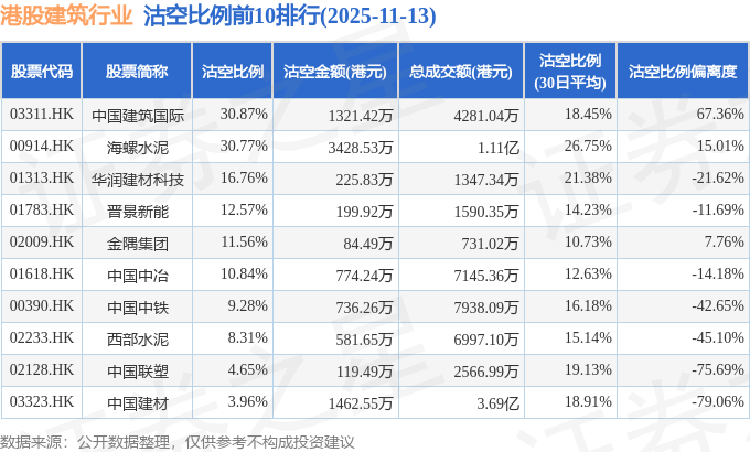 从沽空金额来看,海螺水泥、中国建材、中国建筑国际沽空金额位居行业前三,分别为3428.53万港元、1462.55万港元、1321.42万港元。