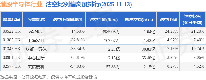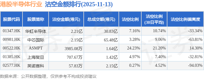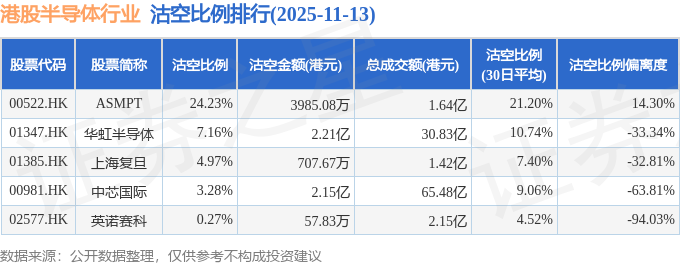从沽空金额来看,华虹半导体、中芯国际、ASMPT沽空金额位居行业前三,分别为2.21亿港元、2.15亿港元、3985.08万港元。