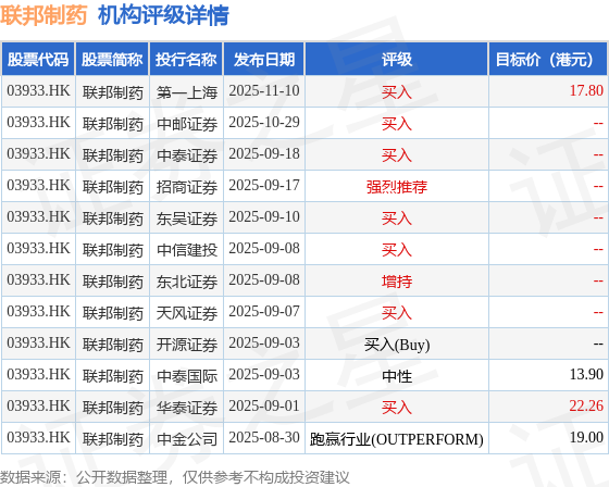 截至2025年11月13日收盘,联邦制药(03933.HK)报收于13.17港元,上涨1.78%,成交量1666.0万股,成交额2.19亿港元。投行对该股的评级以买入为主,近90天内共有7家投行给出买入评级,近90天的目标均价为18.24港元。第一上海最新一份研报给予联邦制药买入评级,目标价17.8港元。