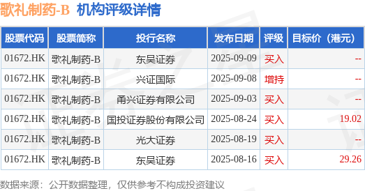 投行对该股的评级以买入为主,近90天内共有5家投行给出买入评级,近90天的目标均价为24.14港元。东吴证券最新一份研报给予歌礼制药-B买入评级。