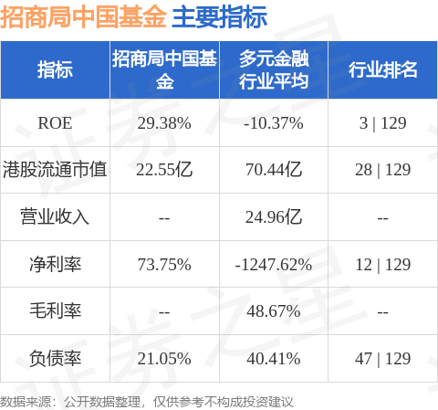 招商局中国基金港股市值22.55亿港元,在多元金融行业中排名第28。主要指标见下表: