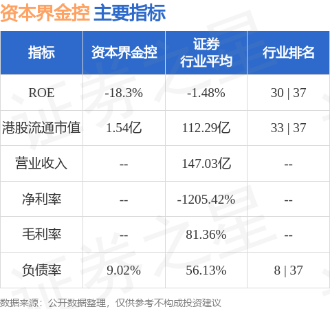 资本界金控港股市值1.54亿港元,在证券行业中排名第33。主要指标见下表: