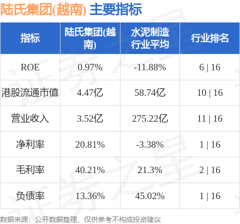 陆氏集团(越南)港股市值4.47亿港元,在水泥制造行业中排名第10。主要指标见下表: