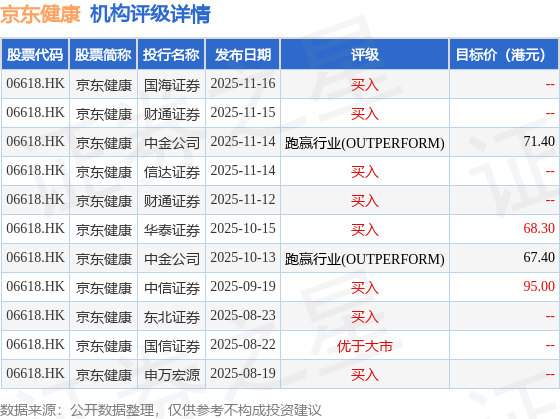 截至2025年11月17日收盘,京东健康(06618.HK)报收于69.4港元,上涨0.95%,成交量810.03万股,成交额5.59亿港元。投行对该股的评级以买入为主,近90天内共有8家投行给出买入评级,近90天的目标均价为75.53港元。国海证券最新一份研报给予京东健康买入评级。