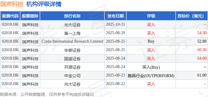 截至2025年11月17日收盘,瑞声科技(02018.HK)报收于40.3港元,上涨1.51%,成交量462.3万股,成交额1.86亿港元。投行对该股的评级以买入为主,近90天内共有5家投行给出买入评级,近90天的目标均价为58.5港元。光大证券最新一份研报给予瑞声科技买入评级。