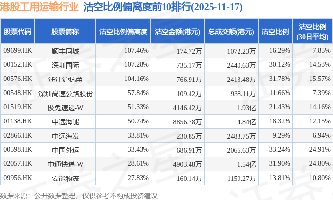 从沽空比例偏离度来看,顺丰同城、深圳国际、浙江沪杭甬沽空比例偏离度位居行业前三,分别为107.46%、107.28%、104.16%。