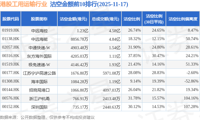 从沽空金额来看,中远海控、中远海能、中通快递-W沽空金额位居行业前三,分别为1.23亿港元、8856.78万港元、4903.48万港元。