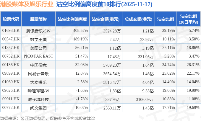 从沽空比例偏离度来看,腾讯音乐-SW、数字王国、美图公司沽空比例偏离度位居行业前三,分别为408.57%、189.19%、86.21%。