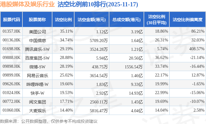 从沽空比例来看,美图公司、中国儒意、腾讯音乐-SW沽空比例位居行业前三,分别为35.11%、34.74%、29.19%。