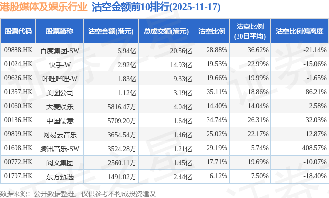 从沽空金额来看,百度集团-SW、快手-W、哔哩哔哩-W沽空金额位居行业前三,分别为5.94亿港元、2.92亿港元、1.83亿港元。