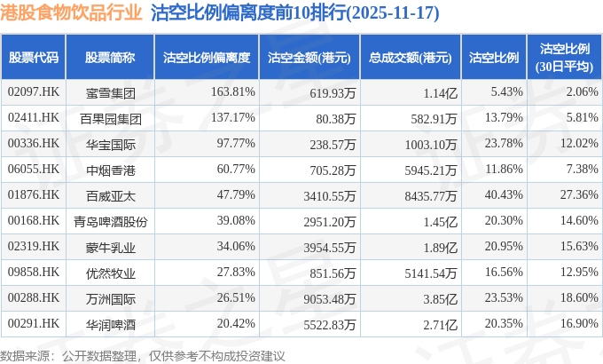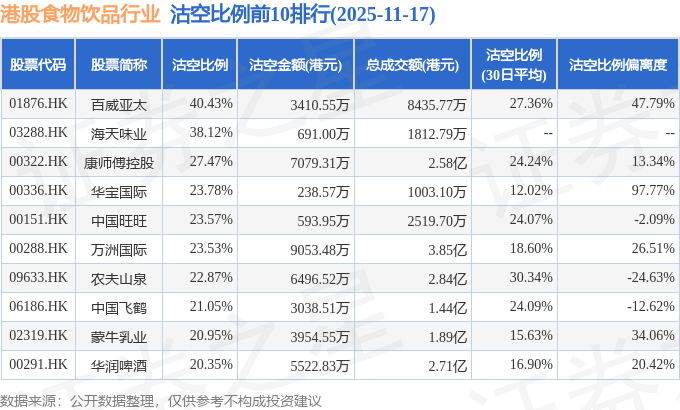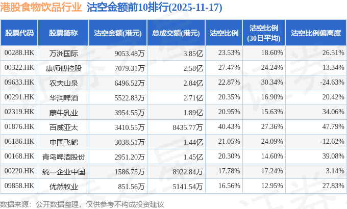 从沽空金额来看,万洲国际、康师傅控股、农夫山泉沽空金额位居行业前三,分别为9053.48万港元、7079.31万港元、6496.52万港元。