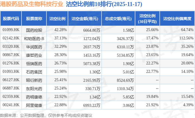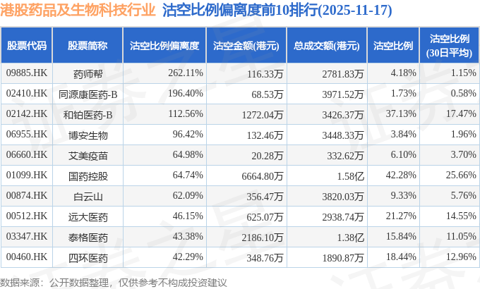 从沽空比例偏离度来看,药师帮、同源康医药-B、和铂医药-B沽空比例偏离度位居行业前三,分别为262.11%、196.4%、112.56%。