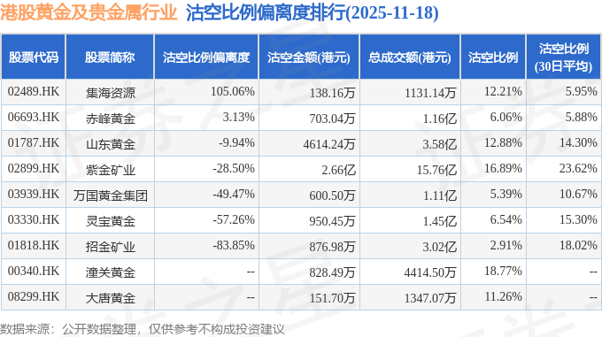 从沽空比例偏离度来看,集海资源、赤峰黄金、山东黄金沽空比例偏离度位居行业前三,分别为105.06%、3.13%、-9.94%。