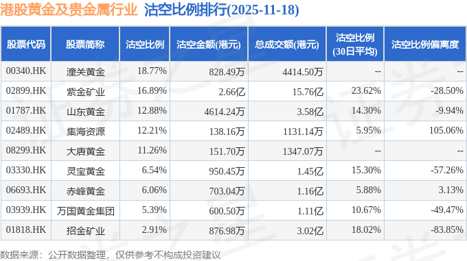 从沽空比例来看,潼关黄金、紫金矿业、山东黄金沽空比例位居行业前三,分别为18.77%、16.89%、12.88%。