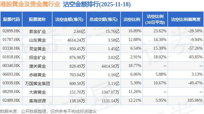 从沽空金额来看,紫金矿业、山东黄金、灵宝黄金沽空金额位居行业前三,分别为2.66亿港元、4614.24万港元、950.45万港元。