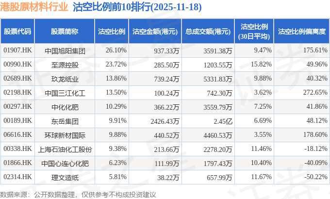 从沽空比例来看,中国旭阳集团、至源控股、玖龙纸业沽空比例位居行业前三,分别为26.1%、23.72%、13.86%。