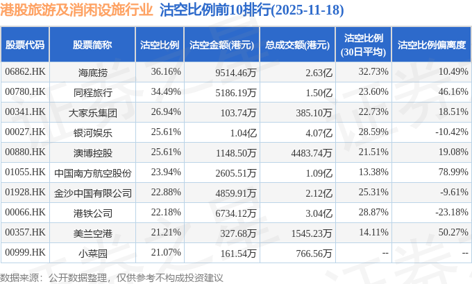 从沽空比例来看,海底捞、同程旅行、大家乐集团沽空比例位居行业前三,分别为36.16%、34.49%、26.94%。