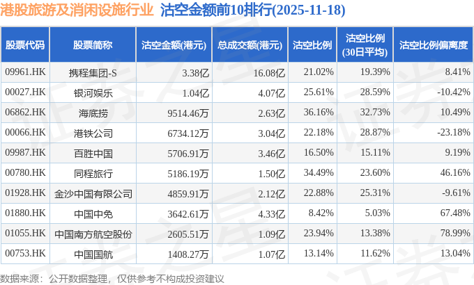 从沽空金额来看,携程集团-S、银河娱乐、海底捞沽空金额位居行业前三,分别为3.38亿港元、1.04亿港元、9514.46万港元。