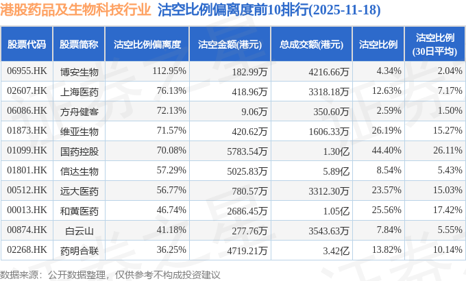 由于港股人民币柜台交易股票成交金额较小,沽空比例普遍偏高,为了避免干扰,已将人民币柜台交易股票从排行表格中剔除。