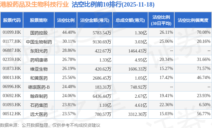 从沽空比例来看,国药控股、中国生物制药、东阳光药沽空比例位居行业前三,分别为44.4%、30.11%、28.86%。