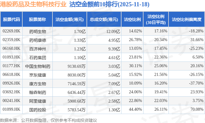 从沽空金额来看,药明生物、药明康德、百济神州沽空金额位居行业前三,分别为1.7亿港元、1.33亿港元、1.23亿港元。